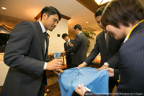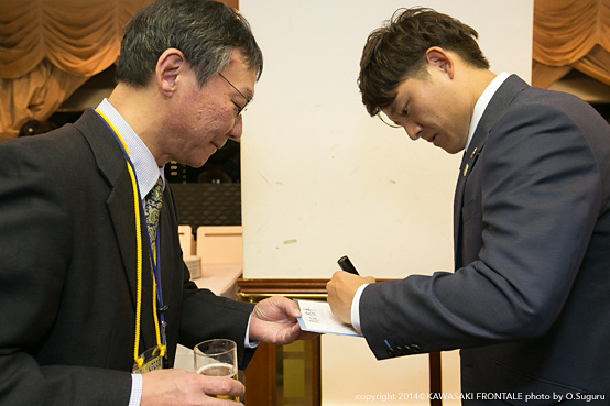 納会はおいしい料理とおいしいお酒はもちろんですが、何といっても一番の楽しみは選手とのふれあい。普段、スタジアムや地域イベントでもほとんど接点がないだけに、この日ばかりは選手と写真を撮ったり、サインをしてもらったり、おしゃべりをしたりと存分に楽しんでいただきました。