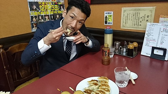 程なく目的地の商店会へ到着すると、まずはサポートショップでもある中華料理「太陸」さんを訪問。早速店の看板メニューである餃子とチャーハンをご馳走になりました。出来たてのアツアツ餃子に舌鼓を打つヨウヘイ。しかも同行スタッフにもチャーハンを取り分けてくれる気遣いも。聞けば、後輩と食事に行っても無意識のうちに取り分けているので、返って後輩が恐縮してしまうんだとか。ヨウヘイらしいエピソードですね。