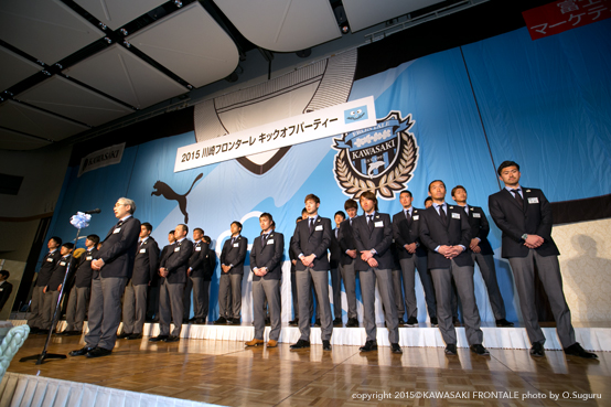 司会進行はスタジアムDJの林さん、小森さん。スタジアムのような雰囲気で開会宣言があり、まずは武田社長から、いつもご支援下さっている多くのスポンサーの皆さんに感謝の言葉と今シーズンの意気込みをお話しさせていただきました。新メインスタンドが完成し、新しくなった等々力について。そしてJリーグが2ステージ制となったこと等、改めて説明がありました。その中でも印象に残ったのは、力強く話していた「今年は、タイトルの匂いがプンプンします!!」という言葉。これには、会場内も「おお~!!」と歓声に包まれましたよ。