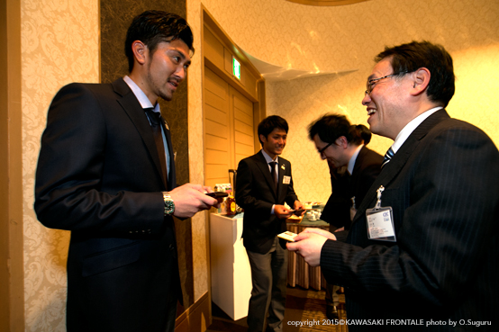 最後の歓談の後、中村憲剛キャプテンから締めの挨拶。「ユウや監督、社長も話していたので同じ気持ちなのですが…、皆さん、仕事関係で等々力に来ることはあると思いますが、プライベートでもご家族など誘ってきてほしいです。僕たちも頑張りますので、ぜひ公私ともにフロンターレにどぷり浸かってほしいです! 今年は、ゴールを決めたら胸を、アシストしたら背中を、袖もパンツの裾も出してアピールしたいと思います!!今年も応援よろしくお願いします!!」と、まさに今日の総括ともいえるケンゴらしい挨拶でした。