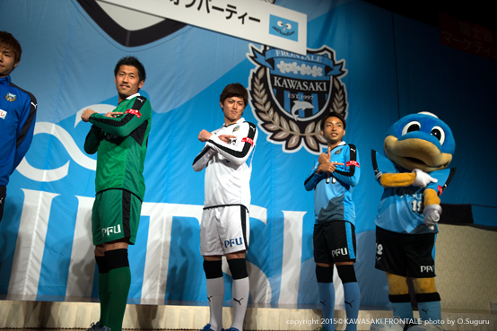 そして、ここで選手を代表し、今年から副キャプテンに就任したユウから新シーズンへの意気込みを語ってもらいました! やたらと気合の入った表情で「今日から、あ、今年から副キャプテンになりました小林悠です。チームみんなでアトラクティブなサッカーをして、皆さんに魅せていくので、応援よろしくお願いします! 最後に…“今年はタイトルの匂いがプンプンする!!”」と、武田社長のものまねとユウらしい言葉で盛り上げてくれましたよ。