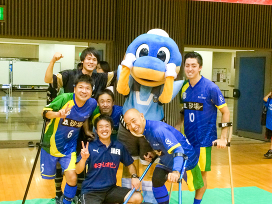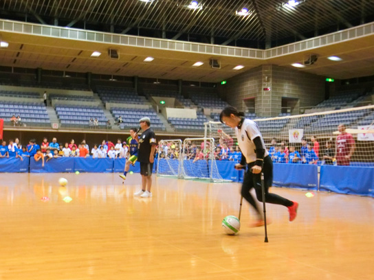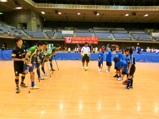 そしてフロンターレのコーナーでは、ドリブルやリフティングを練習してボールのコントロールを練習や、ミニゲーム、そして今年の新たな試みとしてアンプティサッカーの選手チームに挑戦するという対戦を行いました。この対戦が盛り上がること盛り上がること。最初はちょっと遠慮があった子どもたちもだんだん全力になり、またアンプティサッカーの選手たちも子どもたちとの対戦を真剣に楽しんで華麗な技を見せつけていました。