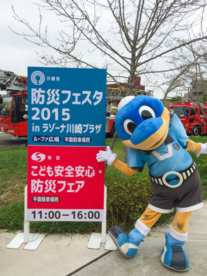 今回は川崎市が行っている「防災フェスタ2015」と同時開催ということで、ルーファ広場と平面駐車場の2か所で開催。ルーファ広場ではイッツコムさんも参加されていて見つけて、すかさず反応するふろん太。ルーファ広場で交通安全のPRを終えたふろん太はこども安全安心・防災フェスタが行われている平面駐車場に移動。川崎市消防局の太助くんと川崎純情小町の皆さんと一緒にルーファ広場から平面駐車場へのパレードにも参加しました。