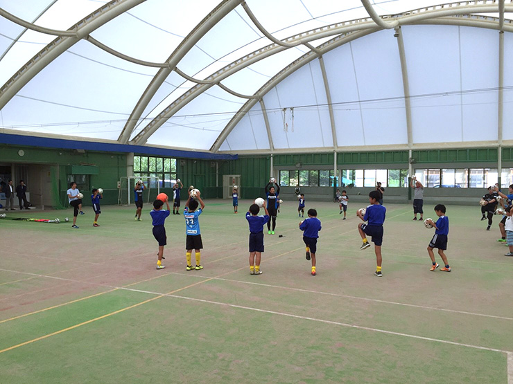 健康促進ということで、サッカーボールを使ったエアロビクス「ボールビクス」をトレーニングに組み込み、普段のサッカー教室とは一味違うサッカー教室を行いました。「ボールビクス」は、音楽に合わせてリズムよく、手に持ったボールとからだを縮めたり伸ばすものや、2人組で向かい合い足を左右交互に動かし手に持ったボールを交換するなどのプログラムがあります。有酸素運動なので、参加者のみなさんは気が付けば滝のような汗が額から流れるほどに!!