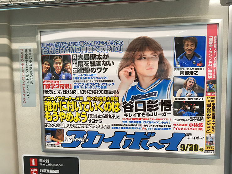 まず、フロンパーク開園より一足先に、「貸切臨時列車ツアー」で川崎の車窓からは幕を開けました。東急長津田検車区から元住吉検車区に臨時列車を走らせるこのツアーは2014年以来2度目の実施。約4倍の倍率のなか当選した、幸運な100名のサポーターが乗車しました! 乗車するやいなや、皆さんの笑い声とシャッター音が響き渡ります。注目の的は車内の中吊り広告。実は、広告の一部をフロンターレバージョンに差し替えていました。スタッフがこのためだけに製作した小ネタの数々。いかがでしょうか。真剣に捉えず、「バカだなぁー」と笑い飛ばしてくださいね。