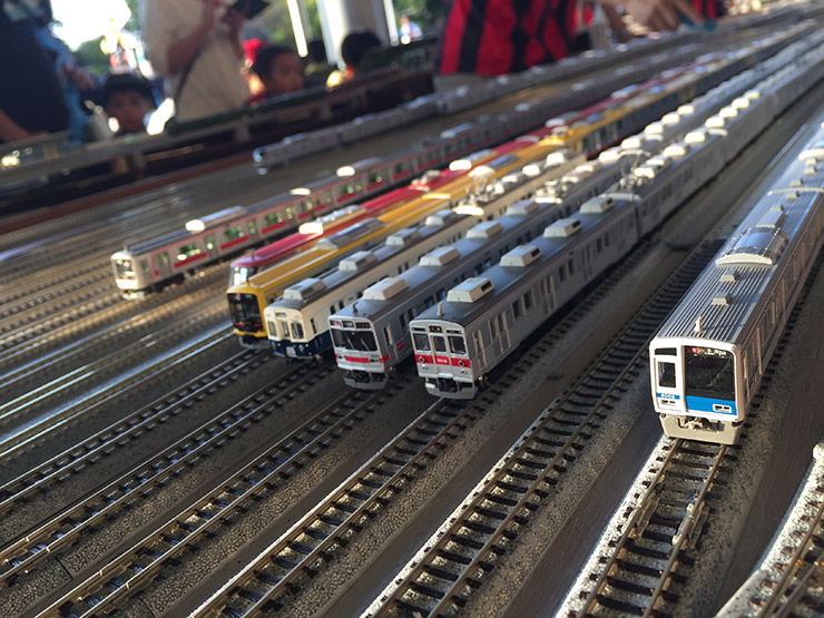 鉄道研究部の皆さんが代々受け継いできたジオラマに東急線を走る全ての車両のNゲージを走らせたというもの。こちらも整理券はすぐに配布終了!「操作できなくても近くで見たい!」という方も多く、ジオラマの周りには沢山の人が集まってましたよ! ジオラマを見に来た方々は口々に「すごい完成度だね」と大絶賛! カメラで写真を撮ると本物の電車と間違えてしまうほどです。皆さんもこの写真で少しでも体感してみてくださいね! というわけで、大きな電車と小さな電車、どちらも大人気でメインスタンド駐車場は大盛り上がりでした!