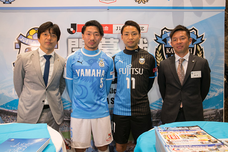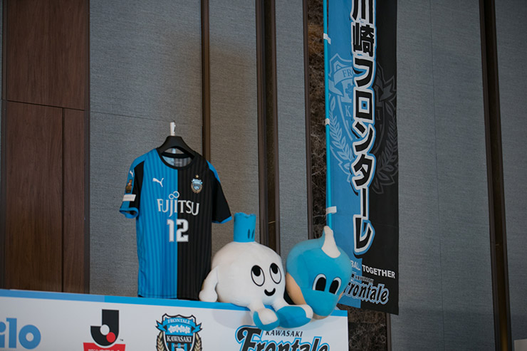 今年も、毎年恒例、キックオフカンファレンスが開催されました。今年は会場となるグランドハイアット東京にてクラブブースの準備を進めると同時に、例年よりも早く選手に集合してもらい、明治安田生命保険相互会社を表敬訪問という、新たな動きがありました。フロンターレから代表で参加したのは小林悠選手。今回カンファレンスに参加するJ1、J2、J3全チームの代表選手が一堂に会すと様々なクラブカラーのユニフォームを身にまとっていることもあり、非常に新鮮な機会となりました。