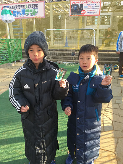 続いては「シュートスピードチャレンジ」です。こちらは1人2球、自分のシュートスピードを測り、速度に応じてトレカがもらえるというアトラクションです。今回は何といってもフッキが移籍後、初めて等々力に復帰する日! ということでこのアトラクションにはフロンターレ時代のフッキ選手のトレカが数枚含まれていました! 皆さん若かりしフッキ選手の獲得を目指して、真剣なまなざしで挑戦していましたよ。見事フッキ選手のトレカを獲得した方は大きなガッツポーズで大喜び! おめでとうございました。ちなみにこの日の最高速度は時速73キロでした。今後この最速記録は塗り替えられるのか、楽しみです!