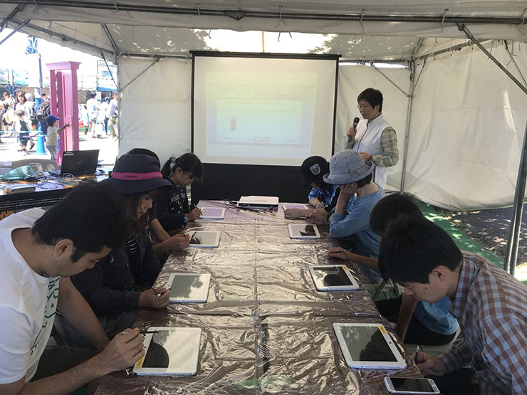 フロンパークエリアでは、その他にもたくさんのワークショップが登場しました! 中でも一際目を引いたのが今回初登場となった「ぬり絵ハンカチ作り」。地面の上にハンカチを置いて、一生懸命ぬり絵をする子どもたちの姿がとっても印象的でした!