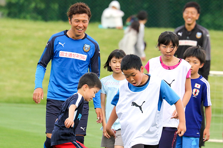プロサッカー選手と一緒にボールを蹴り、こうして触れ合える機会はなかなかないと思います。参加した子どもたちは、きっと一生の記念になったのではないでしょうか。