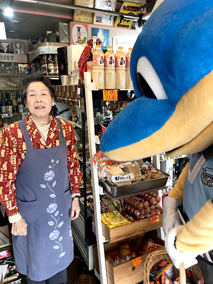 10円ガムから輸入麦酒、町のよろず屋で40年続くお店です。訪問したこの日はハロウィンだったこともあり、ふろん太からロッテさんのお菓子をプレゼントさせていただきました!