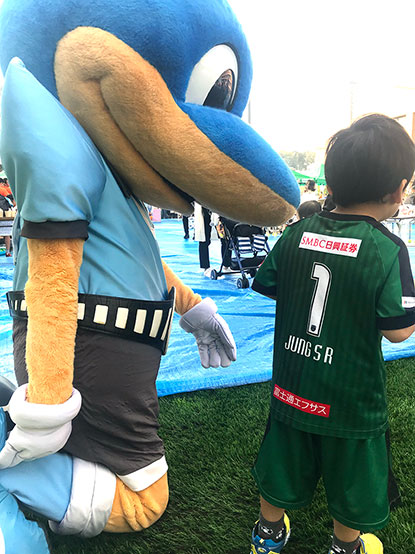 9月の防災訓練にふろん太が参加したこともあり、子どもから大人まで「ぜひ連覇しましょう!」「等々力に毎試合行ってます!」など、力強い言葉をたくさんの声をかけていだだきました。コムゾーとも一緒に写真を撮って終了!!