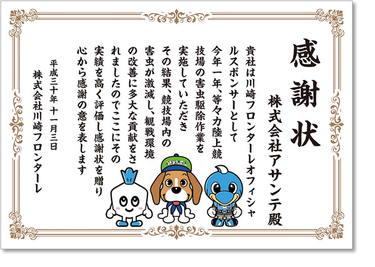 宮内様からは「サポーターの皆さまがお困りだった等々力陸上競技場の害虫駆除をお手伝いさせていただき、結果として感謝状をいただけたことを非常にうれしく思っております。連覇に向けて応援により熱の入る時期です。そんなサポーターの皆さまが快適に選手を応援できるようにご協力をさせて頂きますので今後ともよろしくお願いいたします。