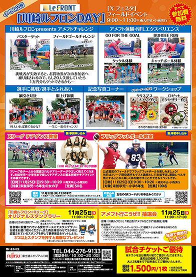 その他にも川崎ルフロン様にご協力いただき、スタンプを集めると豪華景品もらえる「川崎ルフロン スタンプラリー」と、チケットの半券か3つ以上スタンプが押してある「スタンプラリー」の台紙を提示していただくと1回抽選が出来る「アメフト行こうぜ抽選会!」が開催されました。「スタンプラリー」、「アメフト行こうぜ抽選会!!」ともに12/17(月)に東京ドームにて開催される「JAPAN X BOWL」のペアチケットが当たるということで沢山の方に、参加していただきました。