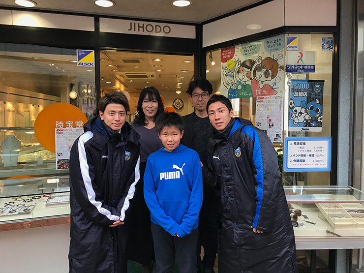 等々力の最寄り駅と言えば新丸子駅。その新丸子駅を中心に4つの商店街からなる「新丸子商店街連合会」に今年は登里選手とヤマこと山村選手がお邪魔しました。二手に分担するほど新丸子駅周辺にはサポショや応援してくれるお店が多く、ノボリが東口にある東栄会からウィズモールへ、山村選手は西口にあるイダイモールから新栄会へとご挨拶。