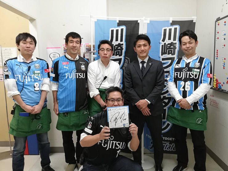最後にお邪魔したのは2018シーズンから商店街として川崎フロンターレを応援していただいている川崎西口商店会さん。商店街にある不動産屋さんの一画をお借りし、サイン会を実施。お越しいただいた皆さんと、写真撮影や握手も行いました。ソンリョンはもちろん、通訳の金さんもサインを求められるなど戸惑いながらも楽しく商店街にご挨拶をして回っていましたよ(笑)