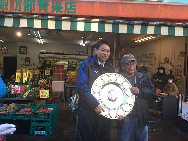 今年はユウが担当し、昨年の優勝時に掲げたシャーレと共に各店舗を訪問しました。長く在籍している割には、久しく平間を訪れていなかったというユウ。