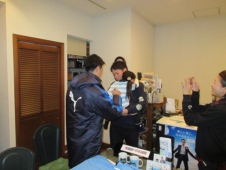 石渡燃料店さんでは、連覇の祝勝会と今シーズンの活躍を祈願する決起集会が行われました。鬼木監督は「ここから1年が始まり、皆さんにパワーを貰います。今年も喜んでもらえるように頑張ります!」と抱負を語りました。また、子どもからの花束贈呈や歌のプレゼントなどもあり、カイオも「カワイイね!」楽しんでいましたよ。最後には、温かいお汁粉と、ホクホクの鰻をいただきました。ブラジルではなかなか食べる機会がないのか、最初は様子を見ていた選手たちも、ジェジエウが食べ始め「ボーン!(オイシイ!)」と叫ぶと、皆どんどん食べていました!