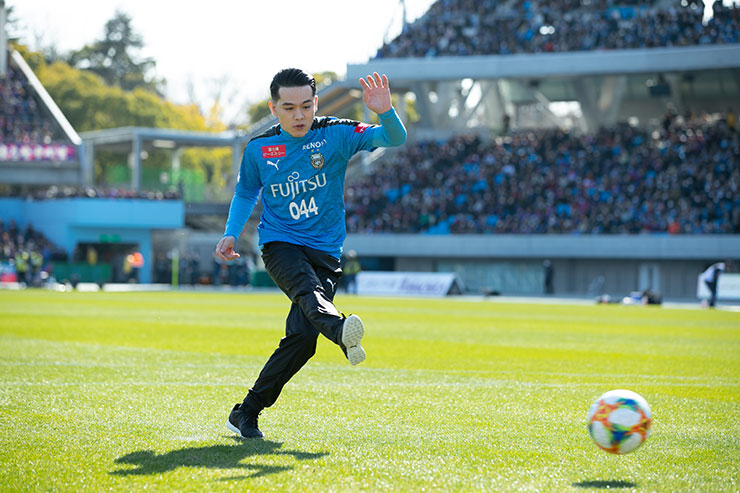 小学生の頃サッカーをやっていて、1度等々力でもプレーしたことがあるとのことで、リハーサルから懐かしそうにボールの感触を確かめ、とても楽しそうに蹴られていました。