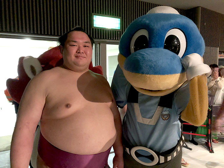 ふろん太の活動は今まで場外だけだったのですが、参加4回目にして、ついに場内での大役を任せられました!! 川崎場所の「特別企画」として、嘉風関と友風関の同門対決が実現。その誘導役に任命されたのがふろん太。花道から土俵際までを友風関とともに堂々と歩きました!!会場のお客さんから「ふろん太くん!」と声をかけていただき、ご満悦のようです。