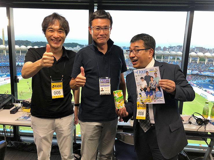 今週の写真。8月4日、等々力陸上競技場の放送室にて。実況の佐藤さん、解説の川崎市サッカー協会副理事長の加藤さんと。