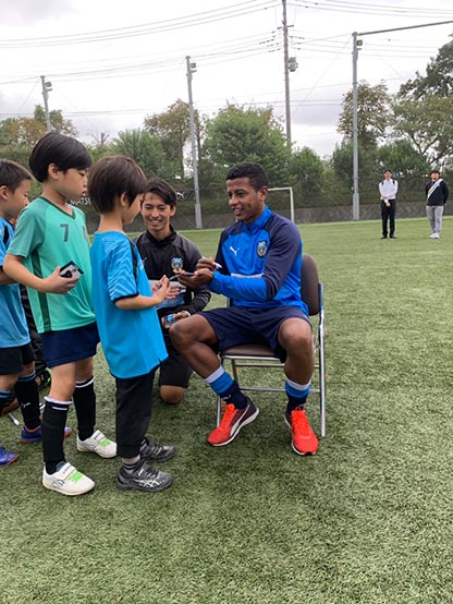 今日来てくれたのは安藤選手とマギーニョ選手。現役選手の登場でみんな大盛り上がり。少しの時間でしたが、記念撮影やサイン、握手会で交流することができました。
