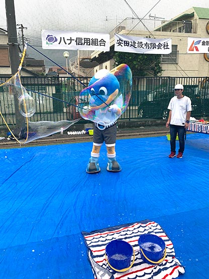 ふろん太もイベントを盛り上げるため会場を練り歩き、来場した皆さんと触れ合っていました。巨大なシャボン玉づくりを体験できるブースでは見事なシャボン玉を作ることに成功! ふろん太の隠れた才能が発揮されました(笑)