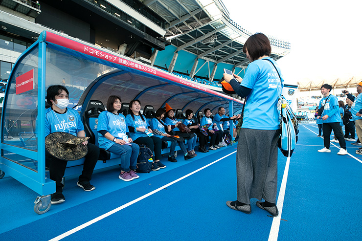 約1時間バスに揺られ、いよいよ等々力陸上競技場が見えてきました。スタジアムに近づくと、仮装をしたサポーターの皆さんがバスに向かって手を振ってくれました。たくさんのクラブスタッフのお出迎えを受けて等々力陸上競技場に到着!