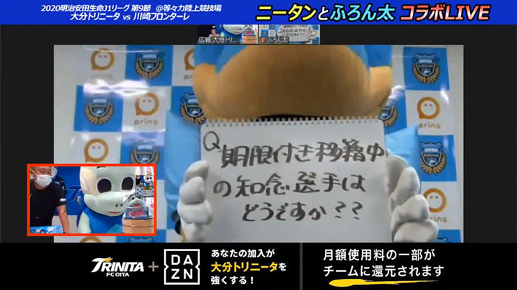 7月の公式戦再開からギフティング(投げ銭)の受付を行っていますが、先日の大分トリニータ戦ではそのうちの一つ「pring」を使ってニータンとふろん太のコラボLIVE配信を実施しました。