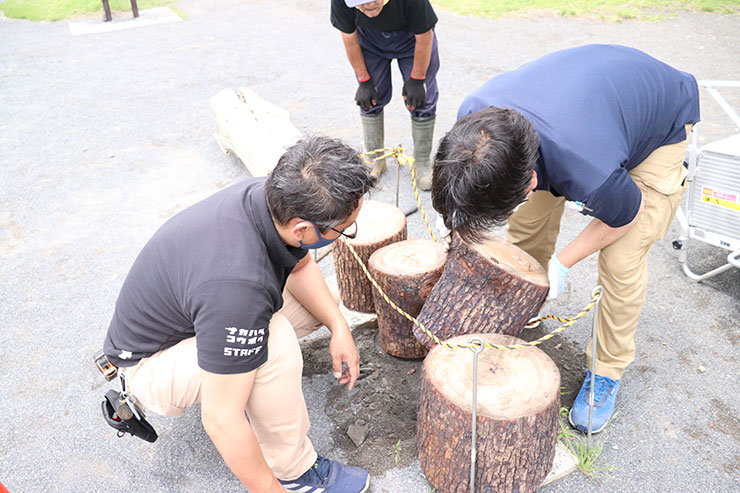 仕上がった丸太に連結金具を通すための穴を開けたら、いよいよ現地で取り付け作業です。この作業はやはりプロである中原工房さんの独壇場。周りで見守るボランティアさん達も手際のよい作業っぷりに自然と見入っていました。