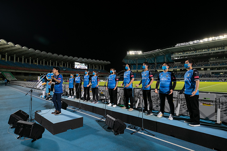 この企画を締めくくるハーフタイムショーには、H₂O元ボーカル・なかざわけんじさんによる名曲「想い出がいっぱい」を披露いただきました!なぜ、なかざわけんじさんに歌っていただいたかわかりますか?そうです!「水の元素記号」が「H₂O」だからです(笑)。見事この企画にうってつけの名曲で後半に向けてサポーターの一体感を高めていただき、試合も勝利することができました。なかざわけんじさん、ありがとうございました!