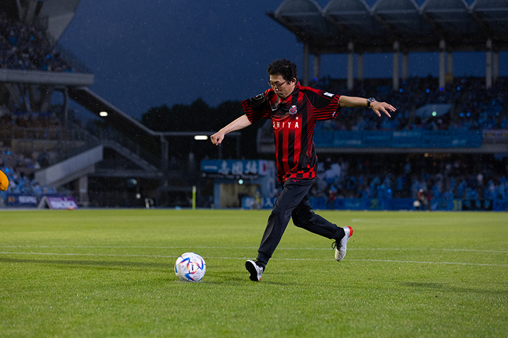 そして試合開始前には、なんと!国民的俳優の大泉洋さんからの爆笑ビデオメッセージをいただきました。(大泉さん、さすがです! 聞いたところによるとクラブスタッフは尺1分でとビデオメッセージをリクエストしたらしいのですが、大泉さんから戻ってきたメッセージは、なんと! 3分!!(驚)どうやって始球式内に収めるかスタッフ頭を抱えたとのこと(笑)大泉さん、ありがとうございました!!)そんなスタジアムが大爆笑に包まれた中、鈴井貴之さんと中村憲剛FROによるPK対決が行われました。キッカーは鈴井さん、憲剛FROがキーパーを務めたこの対決。フロンターレのマスコットたちとonちゃんが応援に駆けつけてくれました。鈴井さんのシュートは惜しくもクロスバー直撃‼対決後、2人には大きな拍手が送られました。
