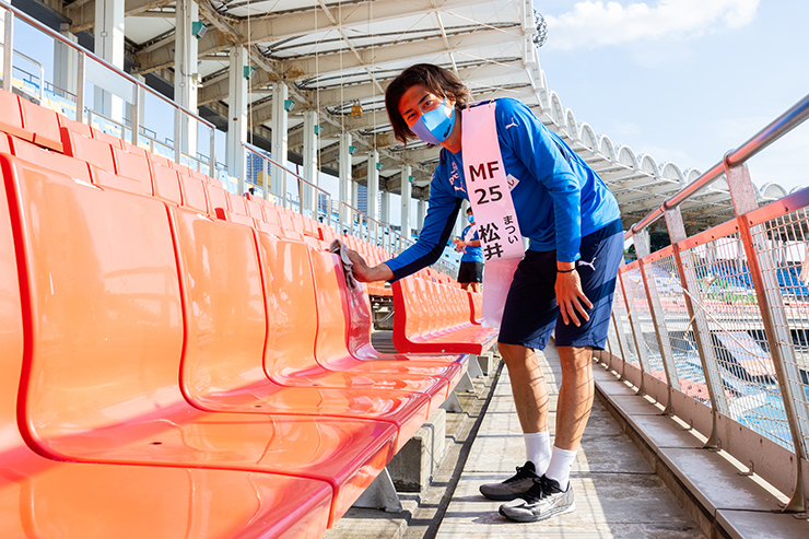選手たち5人で手分けして、バックスタンドとメインスタンドの座席を1席ずつ丁寧に拭き上げていきました。想像以上に重労働なことに驚きつつも、松井選手は「少しの座席拭きでもとても大変だと感じたが、これをボランティアの方々は毎試合前に沢山の座席を拭いて常に綺麗な状態を保ってくれていることを考えると、当たり前の事ではないんだなと改めて感じることができた。」と感謝の気持ちを伝えてくれました。