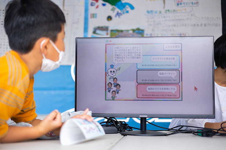 この「川崎フロンターレSDGsすごろく」ですが、川崎フロンターレが取り組んできたSDGs活動を多くの人に楽しく知っていただきたいという思いから、パートナー企業である富士通株式会社の従業員有志の会「フロトラ(富士通×フロンターレ)」に相談して開発が始まりました。京都大学の「エコ~るど京大」という団体が行っているSDGsすごろくをベースに、当初はプログラミング教材として開発が進められていました。開発とは離れますが、時を同じくして、総合的な学習の時間の教材として川崎フロンターレのSDGs活動を取り上げていただいている下作延小学校5年生の皆さんと出会ったことで、すごろくの内容が大きく進化します。6月末から7月上旬にかけて、川崎フロンターレのスタッフや関係者が学校を訪れ、全4回にわたって講演を行いました。その際の様子はこちら。
