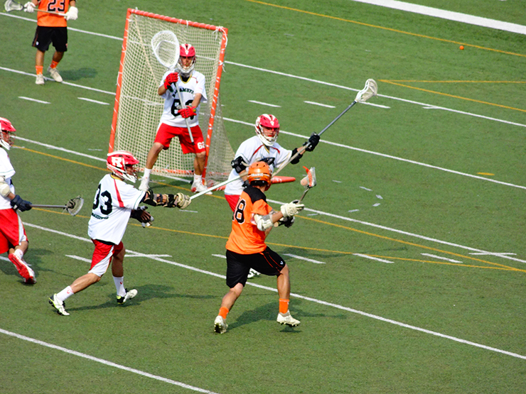 ラクロスとは北米先住民族を起源としたスポーツで、日本では1980年代後半から急速に広がり、今では国内有数の競技人口を誇る団体球技です。「クロス」と呼ばれる網のついたスティックを手にした選手たちがボールを獲り合い、ゴールを狙います。男子は選手間でのぶつかり合いが認められ、その迫力とシュートスピードが持ち味。女子は激しい接触が不可であるために、巧みなパスとフィールド全体を使った攻撃の展開が魅力と言えます。