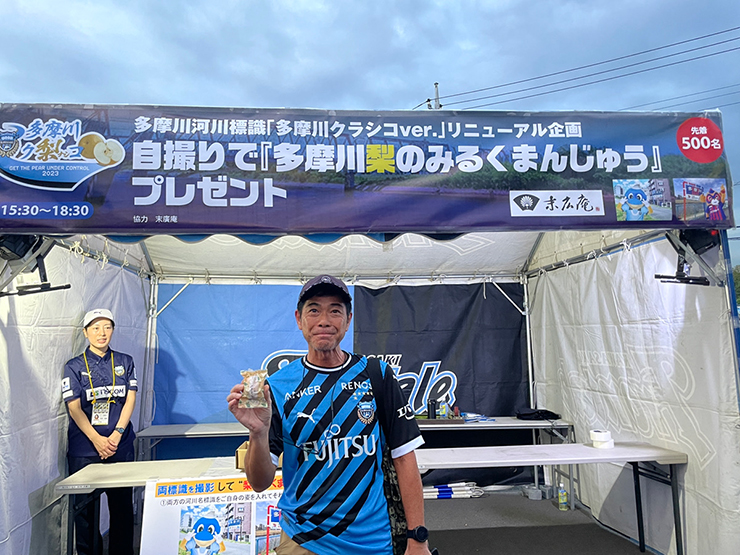 続いて、神奈川銘菓でフロンターレのクラパートナーでもある末広庵さんにご協力いただいた、自撮りで「多摩川”梨”のみるくまんじゅう」プレゼント!!ブース。多摩川河川標識リニューアル企画として、両クラブカラーの河川標識を自撮りしていただいた方に、末広庵さんの「多摩川”梨”のみるくまんじゅう」をプレゼントということで、多くの方が、自撮りをしてくださいました!スタッフ一同大変嬉しい気持ちでいっぱいです‼