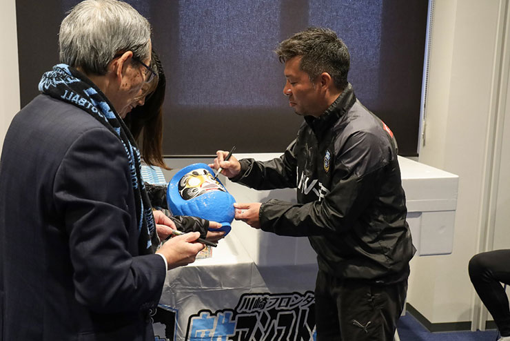 それぞれのご挨拶が終わった後は、麻生アシストクラブの皆さまより贈呈いただきましたフロンターレブルーの必勝だるまへ、梶会長と鬼木監督で必勝祈願の目入れを行っていただきました。