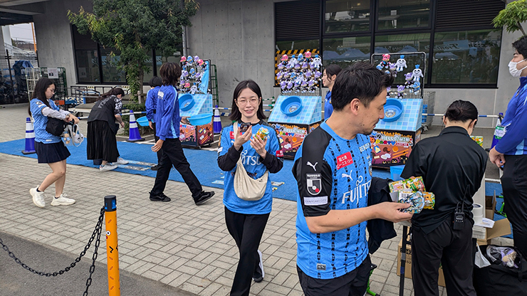 こちらは株式会社タイトーさんにご協力いただき、ゲッタースピンGを等々力に設置いたしました。イベント開始と同時に長蛇の列ができ大人気のブースとなりました!大量のお菓子を両手に抱えるサポーターや獲得しすぐに開けて食べる子どももいました。くるくると回る大量のお菓子に目を輝かせていました!