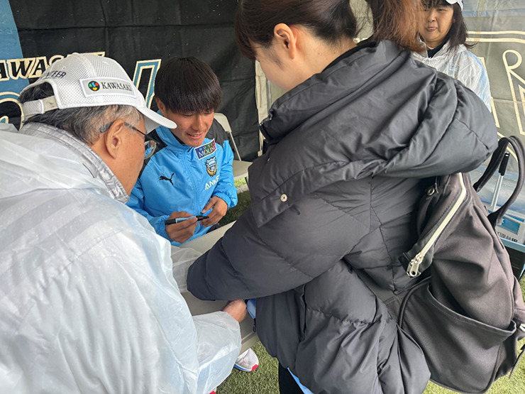 シンは前日の京都戦にて点を決めていることもあり、「昨日はナイスゴールでした!」などのお声がけをサポーターにしていただき、ソウマは「翌日からの代表活動、頑張ユイは多くのサポーターから「初出場楽しみにしています!」とお声がけいただき、「はい!」と元気よく返事を。