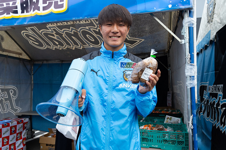飲食エリアでは、JAセレサ川崎さん、あかもと本舗さん、アットエフさん、堂本製菓さん、風の谷幼稚園さん、片平町内会さん、麻生中学校区地域教育会議さん、メゾンユキさん、キッチン鶏家さんにご出店いただき、あっという間の時間ではありましたが、選手がお客さまへ商品をお渡ししたり、呼び込みを行ったりと様々な交流を行いました!!