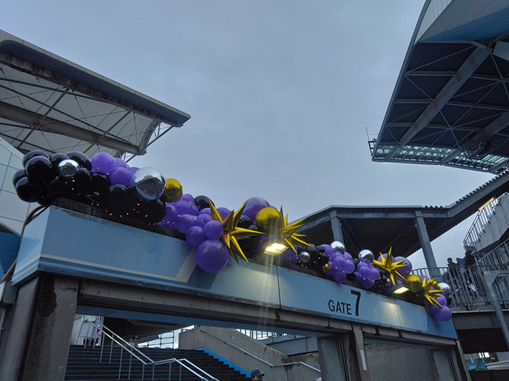 これだけでもインパクトは出ると思いましたが、スタジアムの一角にしか置けないし、もう少しインパクトを出すために大きさも出してサポーターの皆さんが必ず見える場所に出したいと考えた結果、それであればゲートを全てバルーンで飾ればいいのでは? ということになりました。