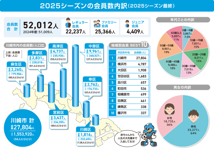 昨年から約200名も増えて、9,961名となり、27人にひとりはファンクラブに入会していることになります。ということは、中原区で考えるとクラスに1人はフロンターレ好きがいることになります!