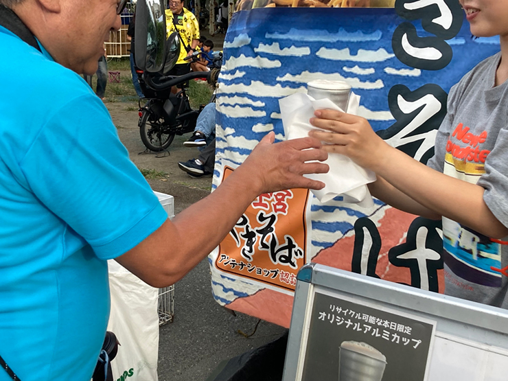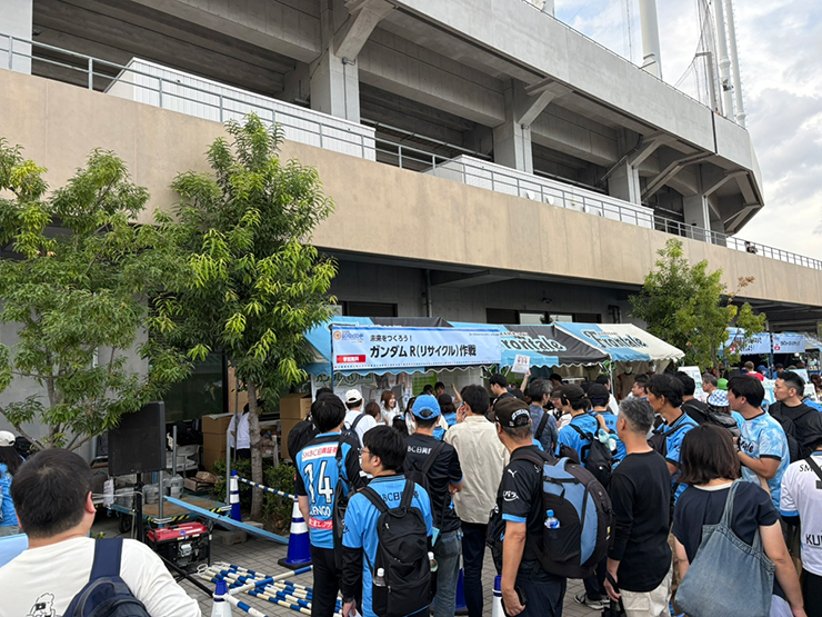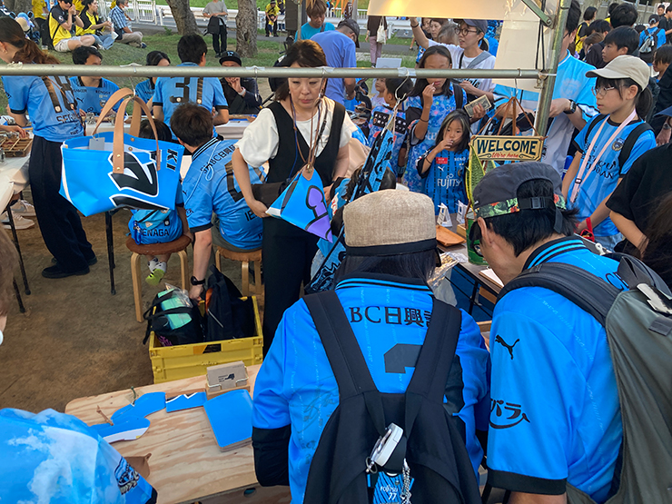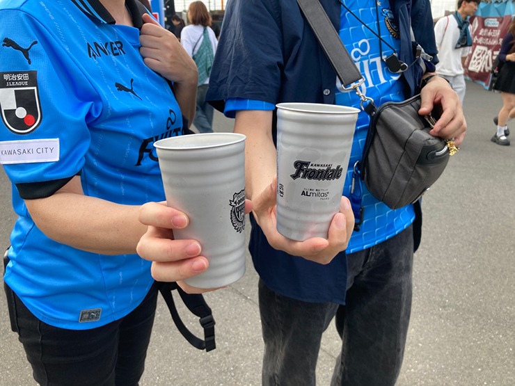 アルミカップ販売ブースでは、多くの来場者が足を止め、特別デザインのカップ片手にビールを楽しむ姿が見られました。リサイクル可能なアルミカップは、この日だけのフロンターレコラボデザイン。来場者からは「持ち帰れるのが嬉しい!!」「このカップで飲むと特別感がある」といった声が多く聞かれ、SDGsやサステナブルな取り組みに関心を持つきっかけにもなりました。提供数には限りがありましたが、ファン同士で情報をシェアしながら楽しむ様子も印象的。美味しいビールとともに、環境への配慮も体感できる特別な時間となり、来場者にとっても、クラブにとっても意義深い企画となりました!!