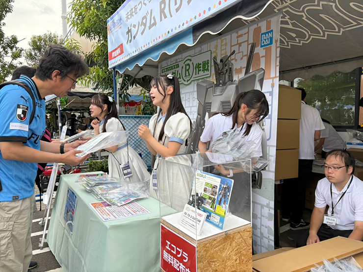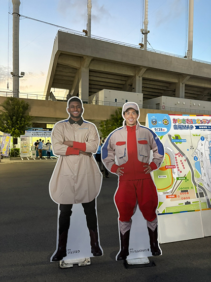 さらに特別ゲストとして登場したのが、プラモデルとファンをつなぐ存在を目指すアイドルグループ「LINKL PLANET」の皆さん。ブースでの配布では、一人ひとりに声をかけながら笑顔で「エコプラ」を手渡し、会場の雰囲気を一層盛り上げてくださいました。そしてハーフタイムには、場内を周回しながらの配布パフォーマンスを実施。サポーターの皆さんから大きな声援と拍手が送られ、スタジアム全体が一体感に包まれました!!