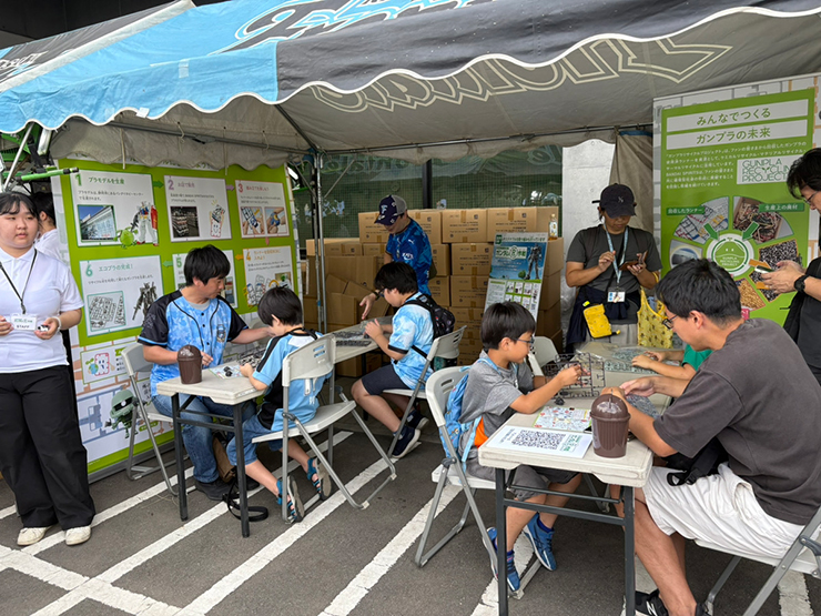 まず今回のイベントの目玉企画のひとつは、「未来を作ろう!! ガンダムR(リサイクル)作戦」でした。会場には、たくさんの「ガンプラ」ファンが集まり、リサイクルによって生まれた特別な「エコプラ」の体験キットを手に取り、夢中で組み立てる姿が見られました。完成したガンプラを手にした参加者の表情は、まさに達成感と喜びでいっぱい。小さなお子さまから大人のファンまで、世代を超えて楽しめる企画となりました。