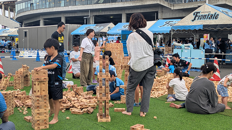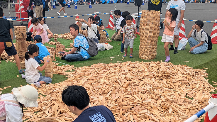 メインスタンド前広場の「やさちぃ き のひろば」では、木のぬくもりを感じながら遊べる特別な体験が広がりました。宮崎県産スギを使った軽く柔らかな「からからつみき」は、無塗装・自然乾燥で小さなお子様も安心して遊ぶことができました。木の香りや手触りを感じながら積み木を重ねる楽しさが伝わってきました。また、静岡市オクシズ材を使用した「シズレンガ」では、大きなブロックと連結用ボッチを組み合わせて、お城やロボットなど自由な発想で遊べます。全国の林産地から届けられた木の魅力を直に体験でき、親子で楽しみながら木材の良さや森林の大切さを学べる空間となりました。木の香りに包まれたひとときは、子どもたちの笑顔と想像力を豊かに育む、特別なひろばとなりました!!