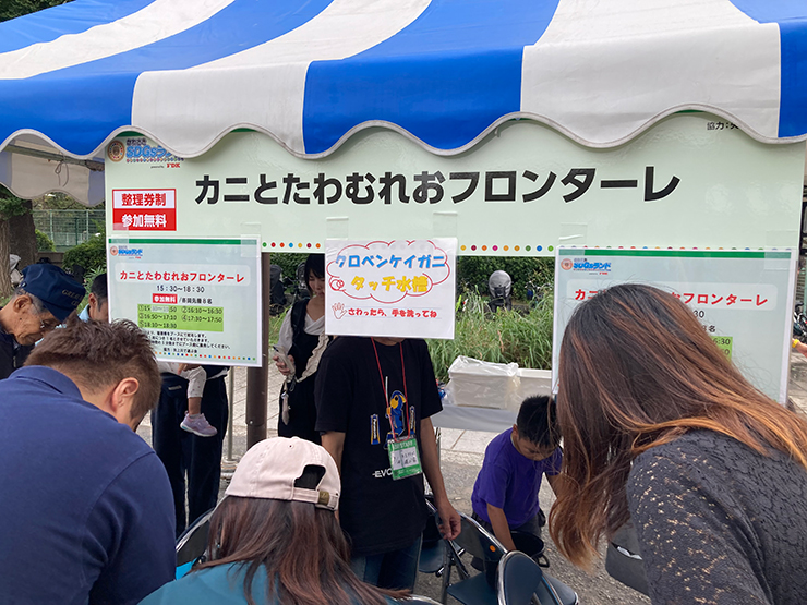 そして「児童遊園」でも、小さなお子さまも安心して遊べるブースがたくさん出店。親子で笑顔を見せる姿が多く、自然とあたたかな空気に包まれていました。特に目立ったのは、カニがいるブースに子どもたちが集まり興味津々でたくさんの方々が集まりました! このエリアはゆったりとした時間を過ごしていて、いろんなことが楽しく学べるエリアとなりました!!