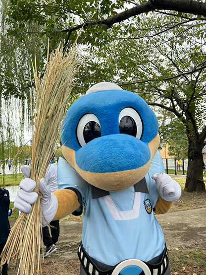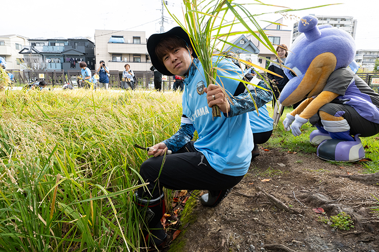 C班は脇坂泰斗選手・田邉秀斗選手・山口瑠伊選手が富士見公園内の「農と自然を体感する広場」にあるワルン田にて稲刈りを実施いたしました。