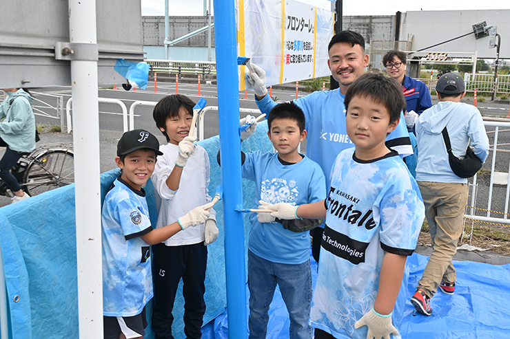 今回は“フロンターレカラー”に染めるため、青と黒の 2 色で塗装を進めました。子どもたちも河原選手も真剣そのもの。保護者の方から「まるで職人さんみたい」という声が上がると、会場は和やかな笑いに包まれました。