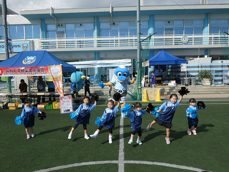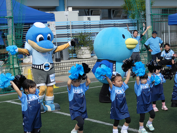 昨年より開講した「キッズチア&ダンス」。今年は健康長寿フェスタで元気いっぱいに成果を発表! ふろん太・さぎぴょんと一緒に楽しく踊りました!!